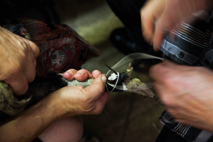 Devant lui, se dresse une cage de métal. Le « parc », grand comme deux tables de ping-pong. Quatre hommes montent sur son tapis pourpre et sortent deux coqs de caisses en bois. Un « croisé » entre une espèce japonaise et thaïlandaise rencontre un « grand combattant du nord », race trapue et locale. Un partenaire ôte le cache protégeant leurs ergots, ces griffes naturelles à l’arrière de la patte remplacées par des pointes d’acier de cinq centimètres.