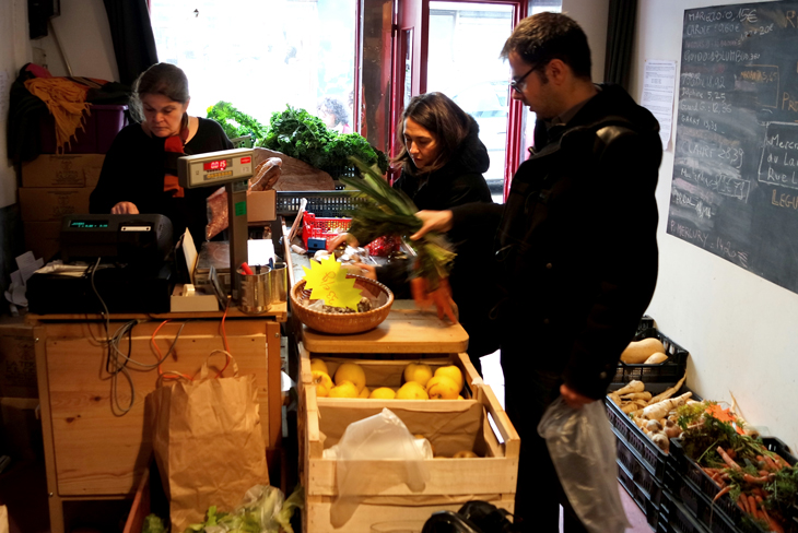 La déco de la boutique est minimaliste, des planches en bois en guise de rayon et un grand tableau noir où sont affichés les prix des produits maraîchers. Carottes, échalotes, betteraves, poireaux… Tout est bio, ou presque. « On a environ 80 pour cent des produits qui sont certifiés, mais ce qui nous importe le plus c’est leur qualité, leur goût » nous explique Christophe, artiste-peintre dans la vie courante. C’est l’un des instigateurs du projet. Derrière sa caisse, il jongle entre l’équipe de « coopérateurs », l’inventaire du magasin, son Macbook et les questions de Streetpress.