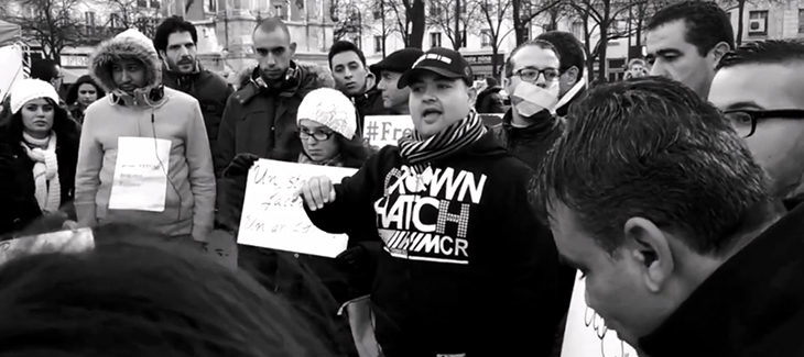 Devant la fontaine des Innocents aux Halles un dimanche de janvier, le voilà encadré par des pancartes et des drapeaux de la Tunisie. Ce jour-là, il organise une mobilisation pour Yassine Ayari, un blogueur condamné à un an de prison par un tribunal militaire pour des billets « portant atteinte » à l’armée. La manifestation durera une petite heure, la trentaine de militants rendant les armes à cause de la pluie. Mais Sleh refuse d’entendre le gong final de son fight :