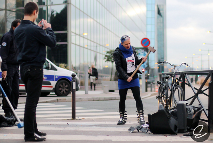 Electre éclate des téléviseurs devant le siège de TF1. / Crédits : Electre