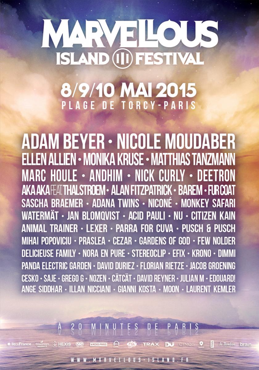 Pour sa troisième édition, le Marvellous accueille la crème de la crème, avec entre autres Adam Beyer, Nicole Moudaber, Ellen Allien, Matthias Tanzmann, Monika Kruse, Parra for cuva, ou encore Nick Curly, qui s’écoute surtout à l’apéro. Ça se passera les 8 et 9 mai à Torcy, puis le 10 mai pour un closing dantesque au Cabaret Sauvage.