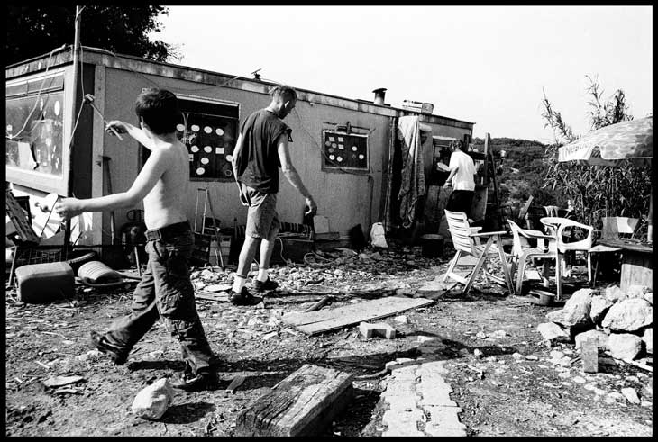 A l’inverse, il y a Roseau. Il m’accueille sur un bout de garrigue en bordure de ville. C’est lui qui s’en sort le mieux parmi tous les mecs que j’ai croisés. « Je loue ce terrain pour 90 euros par mois. » Deux caravanes pourries et un mobil-home vieillot sont posés dessus. « J’ai le RSA, puis je ramasse des légumes et de la viande à la fin des marchés. Je fais la manche à Carrefour. L’argent, ça va. J’en ai assez pour les clopes et les bières. J’ai aussi des poules qui font des œufs.» Il a même une vielle bagnole. « Mais on l’utilise pas trop, l’essence ça coûte un bras. Ce n’est que pour aller au marché le mercredi. » Il héberge des potes – « les vrais amis qui ne vont pas bien » – sur le terrain. Stéphane mourra de son hépatite C dans une caravane et André de sa cirrhose. Roseau sait protéger son espace. Il m’entraîne dans son mobil-home et me montre une collection de couteaux. « Puis, il y a ça si on me fait vraiment chier ! » Il sort un vieux pétard rouillé dont on doute de l’efficacité. Un jour, je le croise en ville avec ses parents et son frère. Ils sont venus lui rendre visite.