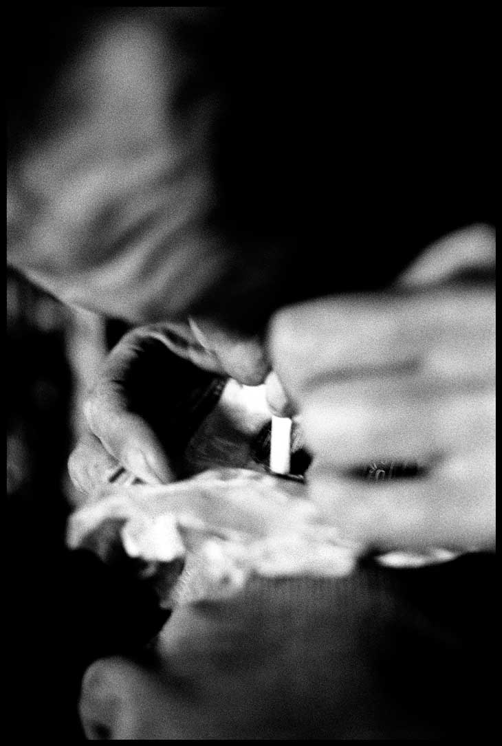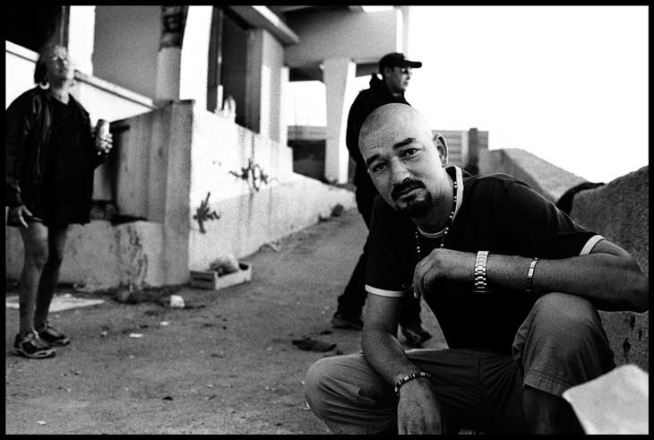 Autour du banc du square, pas mal de nouvelles têtes cet après-midi. Un des gars a deux larmes tatouées au coin de l’œil. « Une par mec tué ». Ambiance. Il est bien énervé et n’aime pas ma présence. Il finit par lancer son poing vers moi et l’arrête à 2cm de mon visage. « T’es un putain de flic, toi ! » Je flippe ma race et lui assure que non. Ses potes l’entraînent au loin. « Il est en manque. Laisse tomber. » A force de prendre des coups, les mecs ont fini par avoir des gouffres à la place de leurs fêlures. Ils tournent à l’alcool et certains aux cachetons. L’excité de service revient après s’être fait une piqûre de Subutex derrière un muret. « Désolé, je savais pas que tu faisais des photos. Ils m’ont expliqué. » La drogue ne tourne pas tellement entre eux. Trop cher. Mais un petit trafic de plaquettes de Subutex, revendues à 5 euros l’unité par ceux qui ont des prescriptions, s’est organisé. Son injection permet des effets proches de l’héroïne. Les bastons sont courantes pour une plaquette avancée et non remboursée.