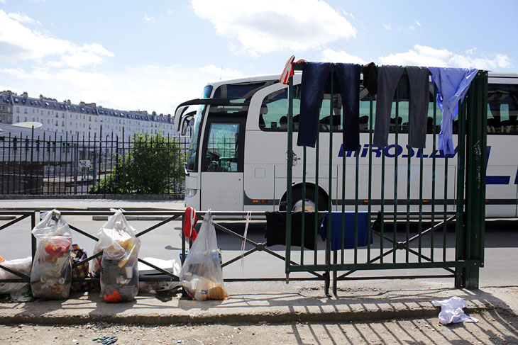 Actuellement ils sont 150 à 200 à vivre ici, en majorité des migrants originaires d’Erythrée et du Soudan du Sud. Des sanitaires et des poubelles ont été installés à la demande de la mairie du 18e arrondissement de Paris. Il n’y a aucun lieu pour cuisiner. Pas plus que des réchauds ou des tables. Tous vivent à même le sol et s’assoient sur les barrières ou les blocs de béton qui encadrent le camp improvisé. Ils attendent toute la journée.