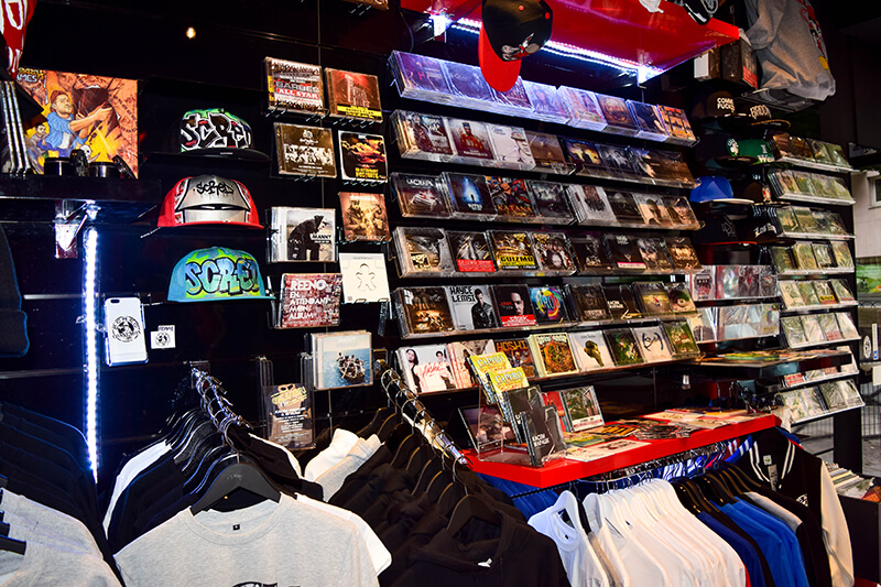 Dans le petit local, la musique qui s’élève des enceintes fait bouger la tête toute seule. L’esprit du groupe indé – jamais produit par une major, très engagé politiquement, est bien là. Près de l’entrée, des CDs de rap indé et des classiques du rap des années 1990. Au fond de la pièce, c’est le rayon casquettes et t-shirts. Bref, l’endroit rêvé pour les fans de la Scred mais pas seulement car le groupe n’est pas « dans l’ego trip ». Et Mokless d’expliquer :
