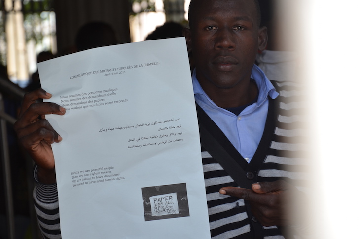 A 15 h 30, les grandes manœuvres commencent. Après avoir bloqué les rues autour de l’église Saint-Bernard, les forces de police regroupent les migrants. Ils les emmènent ensuite aux abords du métro aérien puis les font entrer de force dans l’enceinte de la station La Chapelle, par petits groupes de 3 sous forte escorte policière. Certains brandissent un tract imprimés sur feuille A3 sur lequel on peut lire : « Nous sommes des demandeurs d’asile, nous voulons que nos droits soient respectés. » Après avoir passé le tourniquet, certains embarquent vers une destination inconnue… sans qu’on leur ait laissé le temps de valider leur titre de transport.
