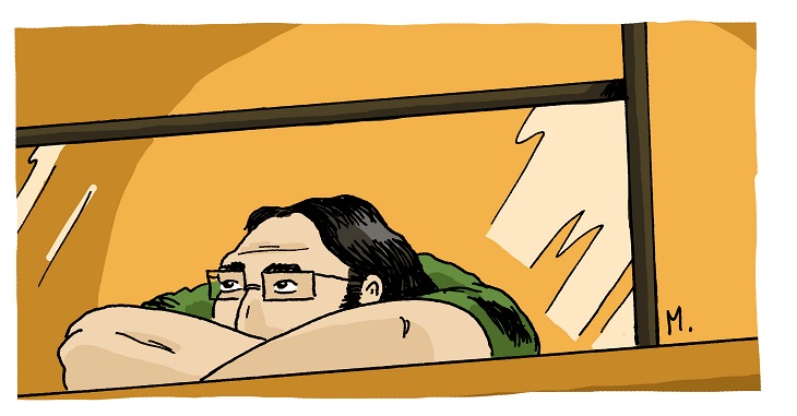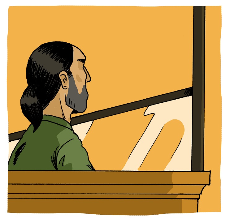 Ancien DJ et militant de BDS, Chafik Asri contemple le tribunal derrière de petites lunettes rondes / Crédits : Marty