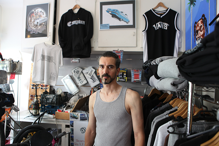 Paris 12e – Cheveux grisonnant short Dickies XXL et débardeur gris, Laurent prend la pose assis sur un vélo torsadé au cadre doré. Un air de G-funk s’échappe de la boutique voisine. Il fait chaud, la rue est déserte, et si l’on fait abstraction des immeubles haussmanniens, la scène pourrait se dérouler à East L.A – le quartier mexicain de la cité des Anges.