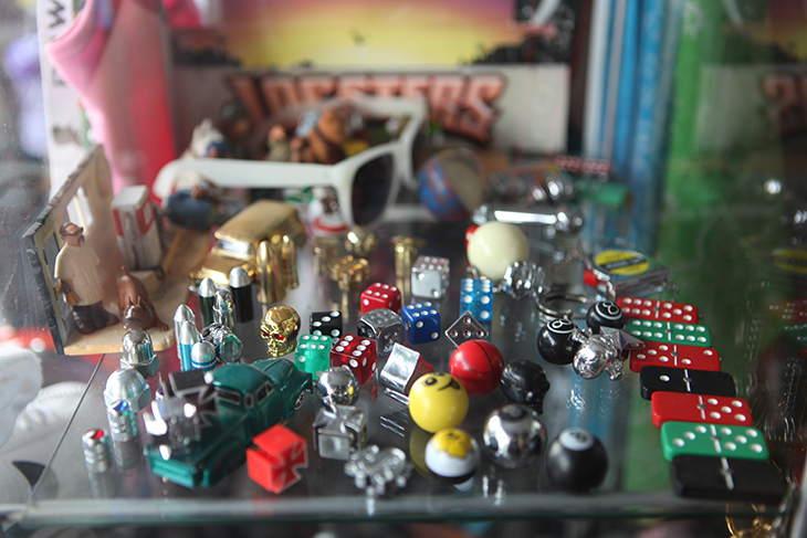 Dès l’entrée, la minuscule boutique de Laurent est envahie d’objets qu’il importe directement de Cali. Là un cadre de vélo, qui vient d’arriver des USA. Ici une plaque minéralogique floquée au nom de sa boutique. Et pêle-mêle des affiches, des Nike Cortez, basket fétiche des latinos de L.A, des figurines et même de la bière d’import : « L’accessoire type que les gens viennent acheter, c’est la lunette noire, tu sais celle de Eazy E. Ou des bandanas. Ici, j’ai des modèles que tu ne trouves pas ailleurs ». Du haut de son mètre 80, Laurent se veut l’évangélisateur d’une culture encore méconnue en France :