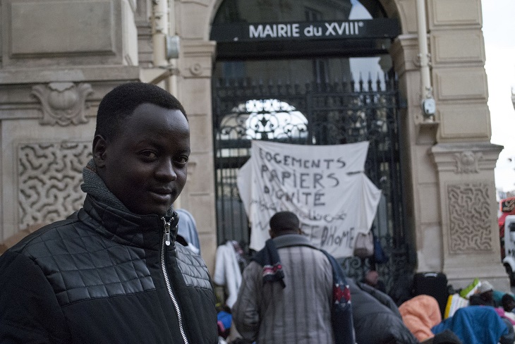 Abdoul Karim se pêle devant la mairie du 18 / Crédits : Alban Elkaim