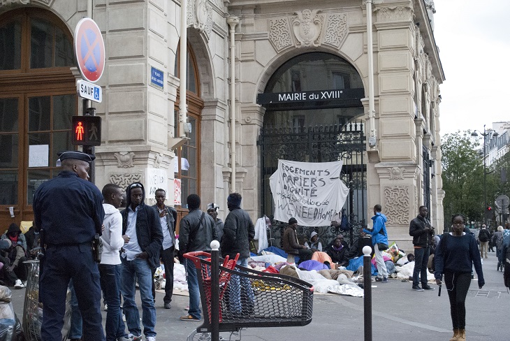 Des réfugiés, des passants, et des flics devant la mairie du 18 / Crédits : Alban Elkaim