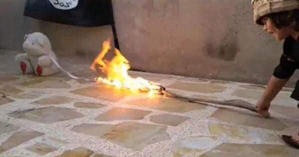 Les hommes de Daesh mettent en scène un enfant brûlant son doudou. « Ils considèrent que les peluches pour enfant sont des idoles donc impurs. » / Crédits : CC.