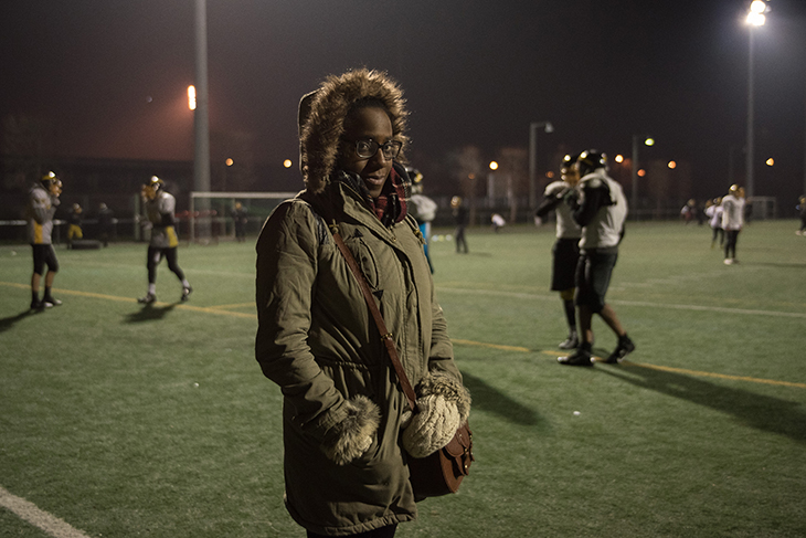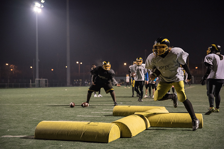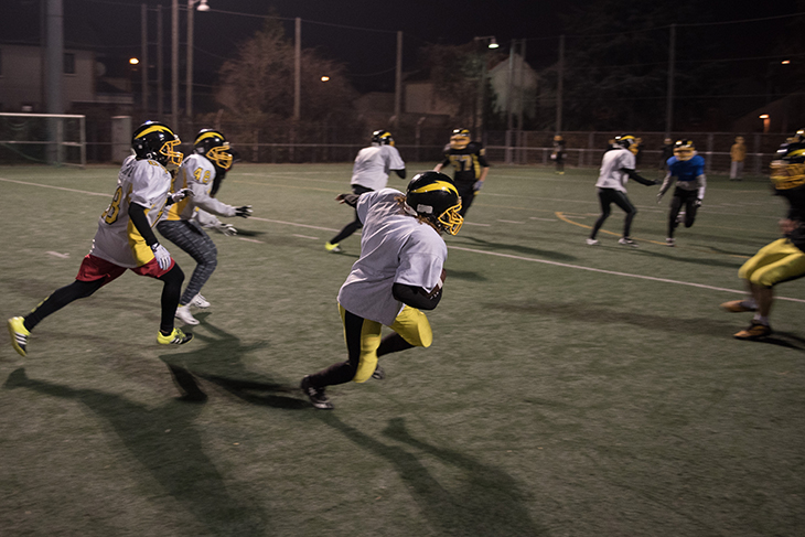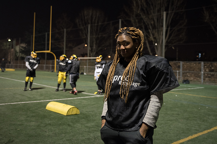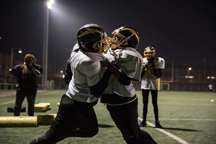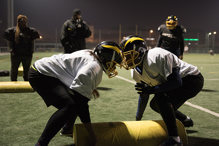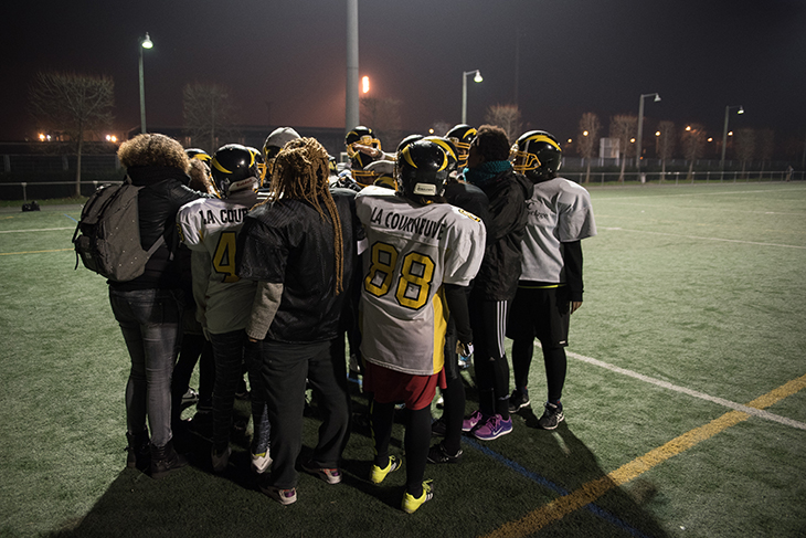 La Courneuve, 19h30 – Malgré le froid mordant, l’équipe féminine de football américain s’entraîne. Elles font toutes partie du club du Flash de La Courneuve. Sabrina et Maeva se font face, penchées, la tête en avant et une main à terre. Un coup de sifflet retentit et leurs épaulières s’entrechoquent, leurs casques se cognent. Dans ce fracas, le coach les pousse à se rentrer encore plus dedans :