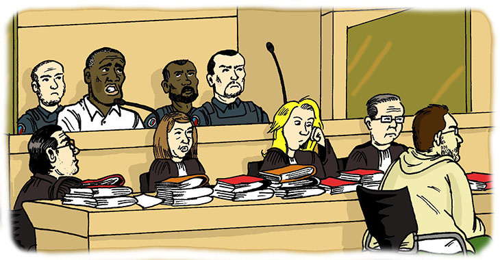 Et Mamadou Ba dans tout ça ? Il aurait conduit le deux-roues. C’est un grand noir athlétique à l’allure placide, détenu pour d’autres faits depuis neuf ans, et qui depuis son box passe son temps à griffonner des mots à ses deux avocats, maîtres Frank Berton Et Roksana Naserzadeh. Il traverse l’audience en fantôme, forcé qu’il est d’assister à son procès où les charges qui l’impliquent sont si faibles que l’avocat général demandera son acquittement.