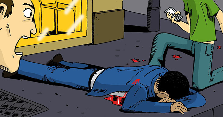 Une balle lui traverse le poumon gauche, l’autre l’atteint à la hanche et lui effleure la verge en sortant. / Crédits : Marty