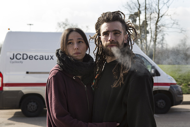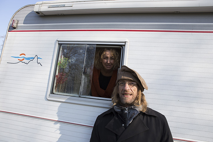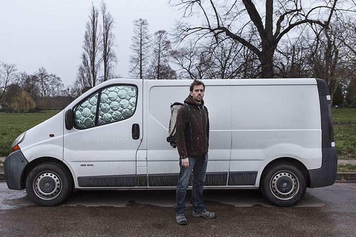 Il est 11h du matin. Les portes arrière du camion de Mika s’entrouvrent. L’intérieur est en bazar. Des croquettes traînent dans un coin. La gazinière est rustique et il se chauffe grâce des briques posées dessus. Deux têtes sortent. Avec Chloé, ils sont encore allongés dans le lit en hauteur. Ils se marrent un bon coup et prennent les premiers rayons de soleil de cette journée en pleine face. C’est l’heure du petit déjeuner. Éternel café-clope. Mika fait chauffer de l’eau et sert 3 grands mugs qu’il partage avec David sur le trottoir. Comme toujours, le chien veut jouer et les deux hommes finissent par essayer de le faire monter sur le toit du camion en y posant son jouet, sans succès.