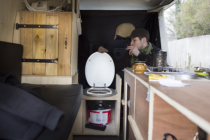 Une batterie alimente des spots lumineux encastrés dans le plafond. Il a même des toilettes sèches qui sortent d’un tiroir posé au sol.