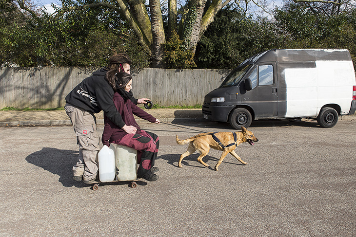 Mika pose les bidons sur le skate et se fait tirer par le chien jusqu’au point d’eau. / Crédits : Yann Castanier