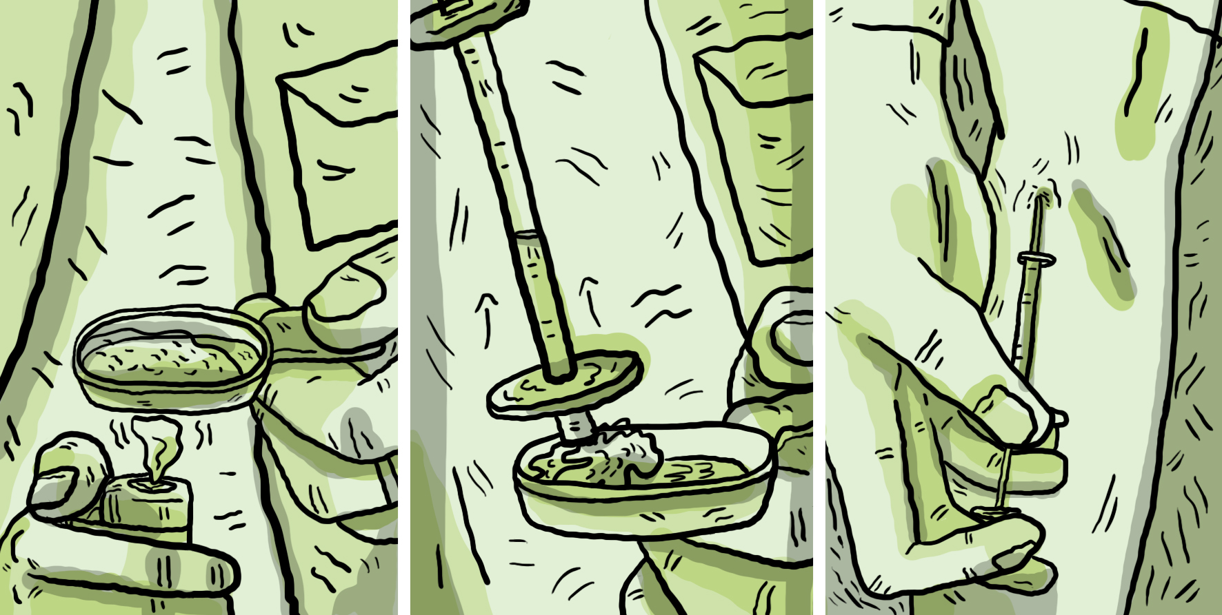 Entre 3 toxicos, il déballe son kit d’injection sur un terre-plein derrière la Gare du Nord. Le rituel est toujours le même. Il commence par se nettoyer les doigts avec une lingette puis ouvre une gélule de skénan qu’il vide dans une cuillère jetable avant d’ajouter de l’eau stérile. Avec son briquet, il enflamme un coton alcoolisé qu’il approche de la mixture pour dissoudre le produit. « D’autres brûlent le skénan pour le caraméliser avant de mettre l’eau. On dit “faire ça à la russe” car ce sont les mecs des pays de l’Est qui ont importé ça », indique-t-il, tout en mélangeant sa préparation avec le piston de la seringue.