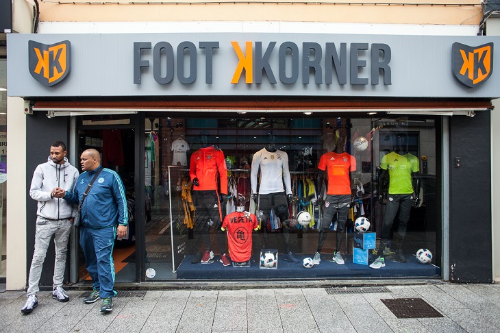 A 20 minutes de là, Roubaix et sa Grand’ Rue, l’artère commerciale du centre-ville. « C’est un peu le bordel, on prépare les soldes », prévient Birame en entrant dans le magasin. Dans les rayons, les cartons s’empilent au sol sous les maillots accrochés à des portants. Les vendeurs en survêt’ s’affairent. Une mère de famille insiste pour se faire rembourser un maillot. Pas la bonne taille pour son fils en prison. Un jeune demande si son maillot préféré est en rayon. Les affaires roulent dans le premier magasin des frères N’Diaye. En 2012, ce shop roubaisien et celui de Lille sont les derniers Foot Corner ancienne génération. Et ces deux boutiques appartiennent à Cyril et Birame. Ils rachètent l’enseigne à l’agonie, changent l’identité visuelle, remplacent le « C » par un « K » « pour avoir plus d’impact ».