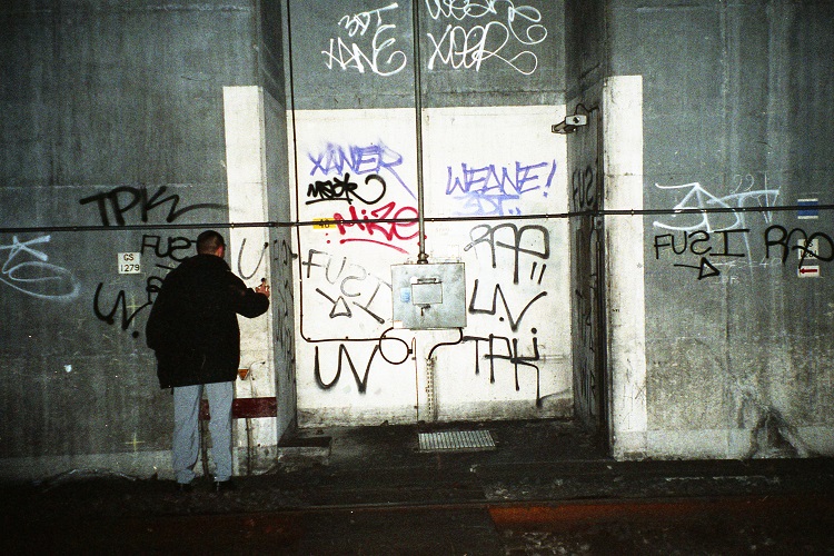 À la fin du repas, on était bien bourré. Certains sont partis en boîte, d’autres sont rentrés chez eux. Fuzi et moi, on est parti graffer dans les tunnels du métro. On a fini dans un dépôt de Saint Lazare à faire un end to end . On a graffé jusqu’au petit matin. On a même croisé un chauffeur de métro. Il a eu vachement peur le gars. Il nous a dit : « c’est pas grave pour cette fois les gars mais faites gaffe. Bientôt il y aura un maître-chien pour surveiller le dépôt. » Je suis sur que c’était un coup de bluff.