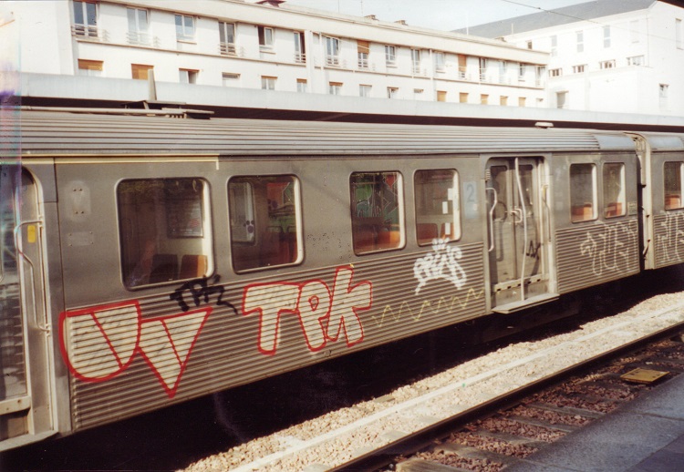 Ce whole car [peinture couvrant l’ensemble d’une rame du métro, ndlr] on l’a fait sur le RER C dans un dépôt à Juvisy. Il faut savoir qu’à cette époque la ligne C, c’était New York. Tous les graffeurs de Paris venaient peindre cette ligne. La SNCF était dépassée, les trains roulaient pendant plusieurs semaines avant d’être nettoyés. Et à mon avis, cette peinture c’est l’une des meilleures.