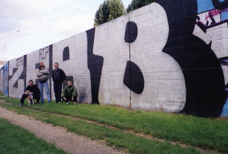 C’est à cette époque que Zeab, un membre de TPK, meurt dans un accident de voiture sur le périph’. Avec les UV, on a décidé de lui rendre hommage en faisant une peinture dans une usine près de chez nous, à Herblay. Puis l’équipe TPK a décidé de peindre un gros Zeab en couleur, plus travaillé, le long du canal de l’Ourcq du côté de Bobigny. On a voulu faire aussi notre graff. Fuzi s’est occupé du lettrage puis on a tous rempli : Fuzi, Salo, Trane, Kilo et moi.