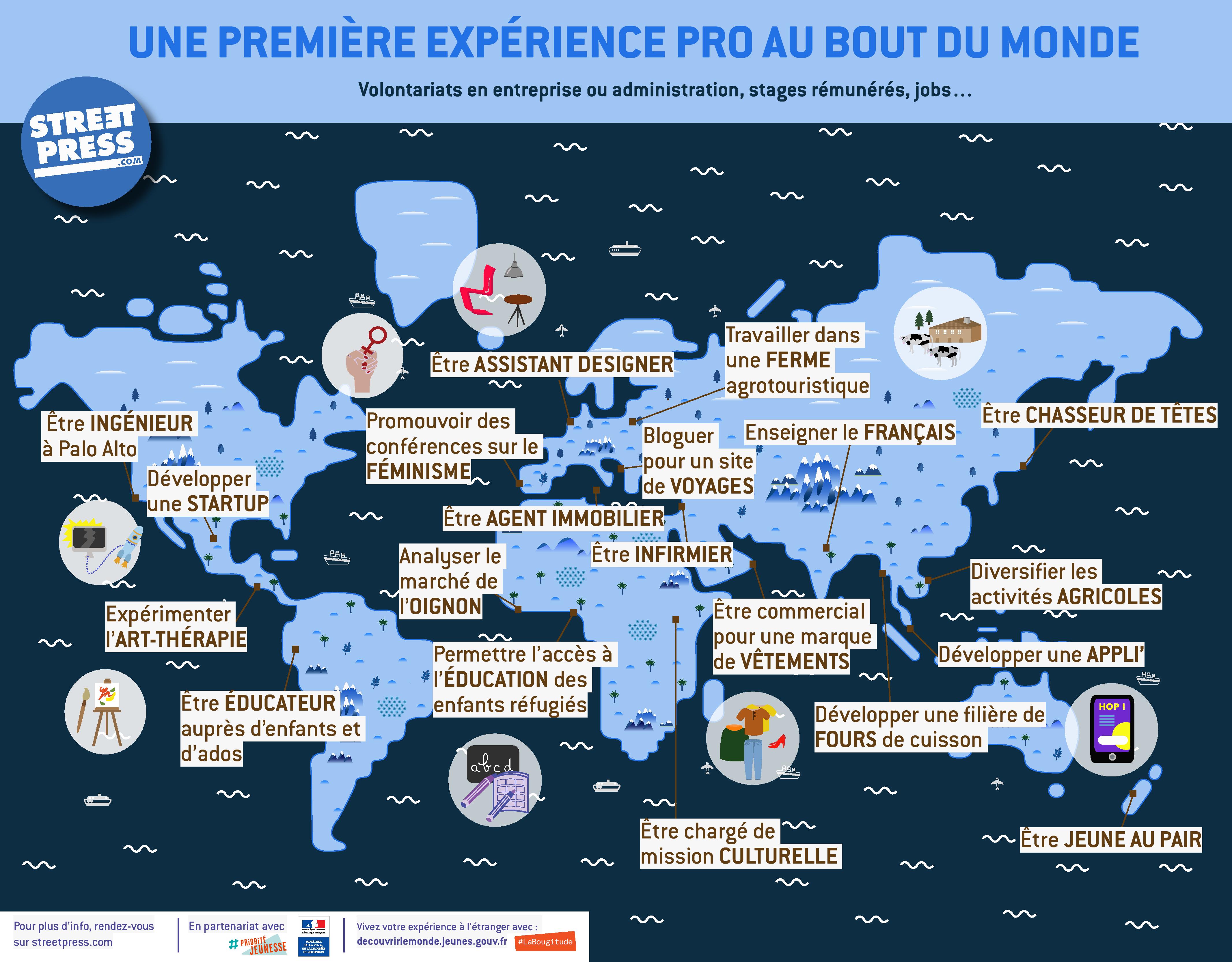 Les deux premiers représentent des Volontariats à l’International, soutenus par l’ambassade de France à destination des 18-28 ans. L’un se déroule dans une entreprise française implantée à l’étranger et recrute le plus généralement des jeunes qui viennent d’école de commerce, d’informatique ou d’ingénieurs. L’autre concerne les administrations, lesquelles cherchent des diplômés en langues étrangères, droit, aide au développement… L’avantage, c’est qu’ils vous offrent un salaire très correct et un environnement cadré.