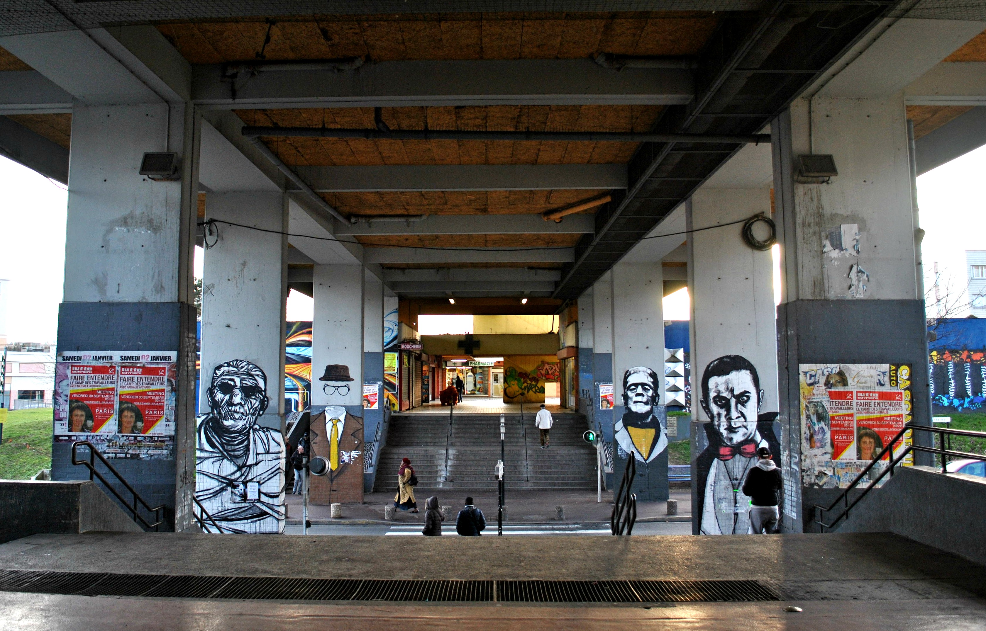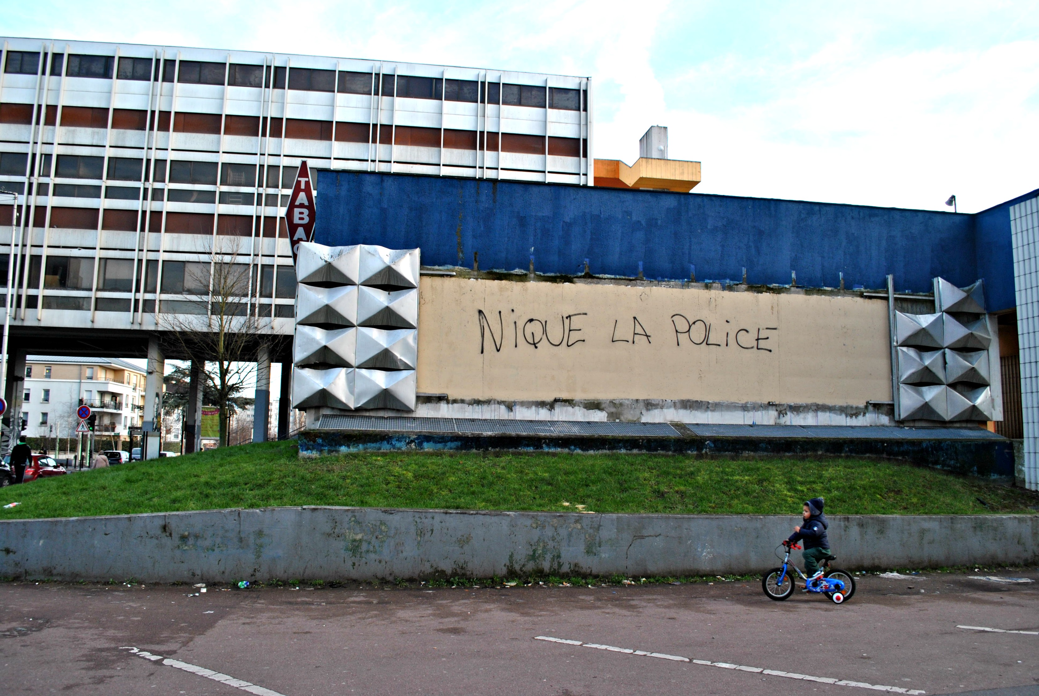 Le soleil décline sur les 3000. À deux pas de la galerie des Galions, où la plupart des commerces ont fermé, un attroupement de gendarmes marque le coin de la rue. Ils sont une douzaine autour de deux voitures, matraques en main. Deux sont à cheval, et tranchent avec les blocs d’asphalte. Derrière eux, le commissariat et son rideau cassé à moitié baissé font grise mine. En face, sur le mur jauni, un « nique la police » a été graffé. Du côté des forces de l’ordre, c’est le black-out médiatique. Le commissariat, le poste et le bureau de police d’Aulnay-sous-Bois n’ont pas souhaité répondre à nos questions. Comme la Mairie, qui explique :