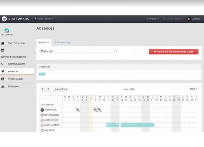 Le « Staffomatic », fameux « site de gestion d'EMPLOYÉS », permet notamment aux livreurs de « soumettre » une demande de congés qui doit être consentie et validée par Deliveroo. /