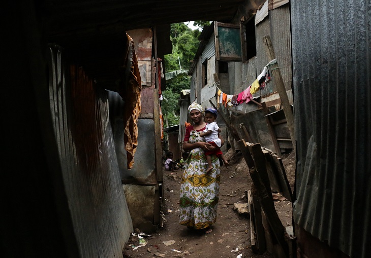 Une femme marche dans les ruelles étriquées du bidonville de Kawéni, son enfant dans les bras. / Crédits : Axel Roux