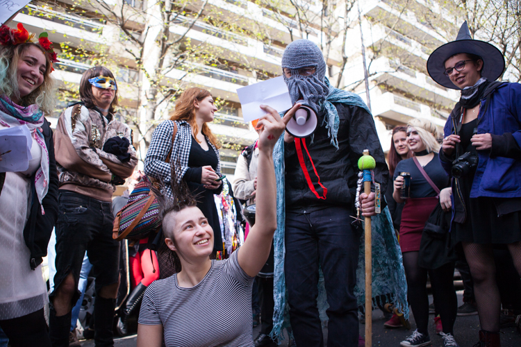 13 heures, Ménilmontant – « Précisez-moi ce que l’Etat a fait de bon ces 150 dernières années. Rien ! » Une sorcière invective une poignée de militants de Benoit Hamon, qui s’empressent de remballer leur matériel. Devant la station de métro, plusieurs centaines de personnes sont venues crier leur ras-le-bol des élections.