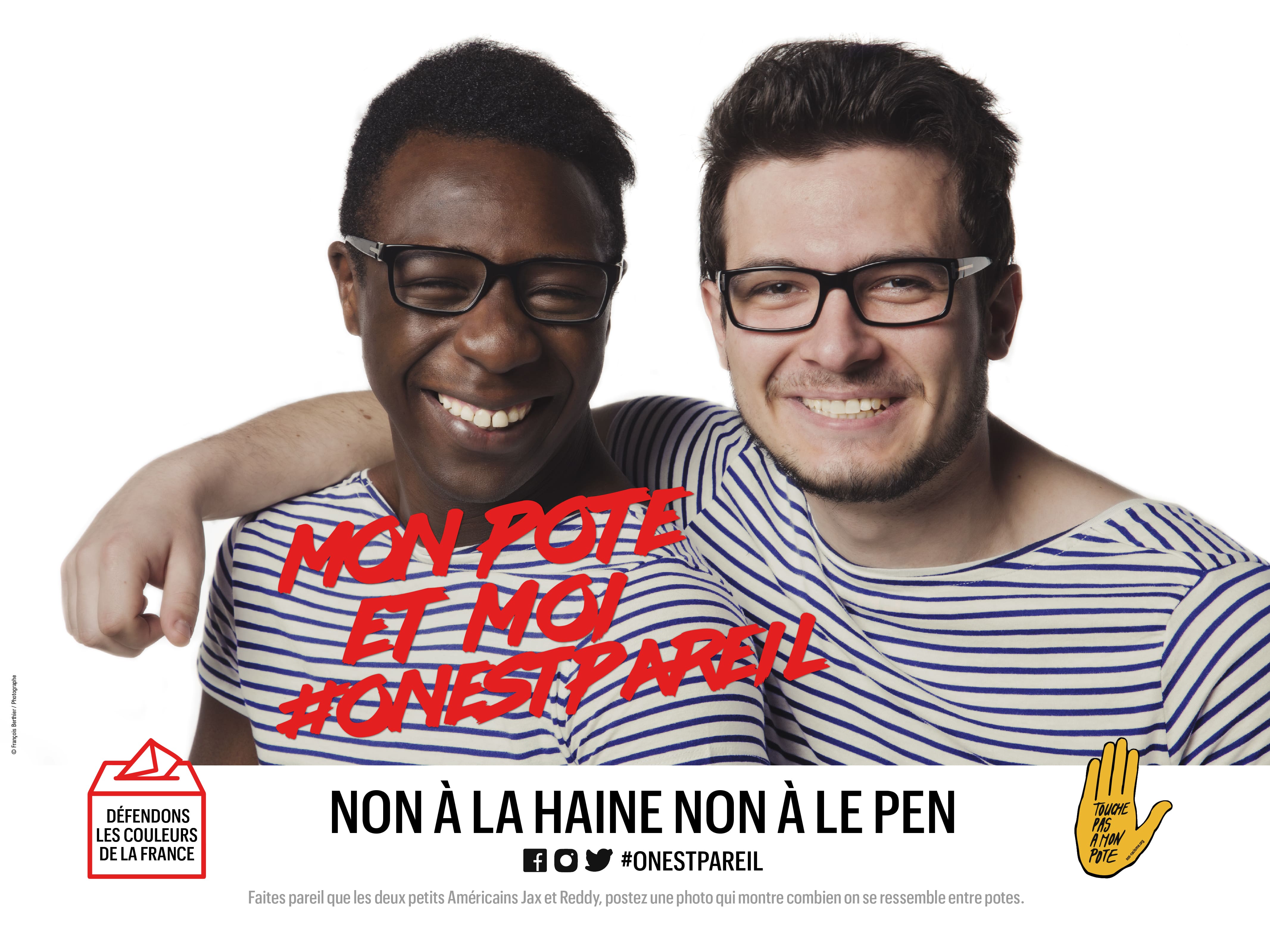 La dernière campagne de SOS Racisme est plus qu’affligeante. L’idée est de contrer les idées du FN. On y voit un.e blanc.he qui prend par l’épaule son ou ses ami.e.s noir.e.s et rebeu.e.s, tous et toutes tout sourire, avec le slogan : « Mes potes et moi on est pareils ».