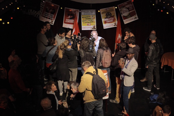 La petit "meute" de journalistes autour de Poutou. De nombreux médias accrédités ne sont finalement pas venus. / Crédits : Sarah Lefèvre