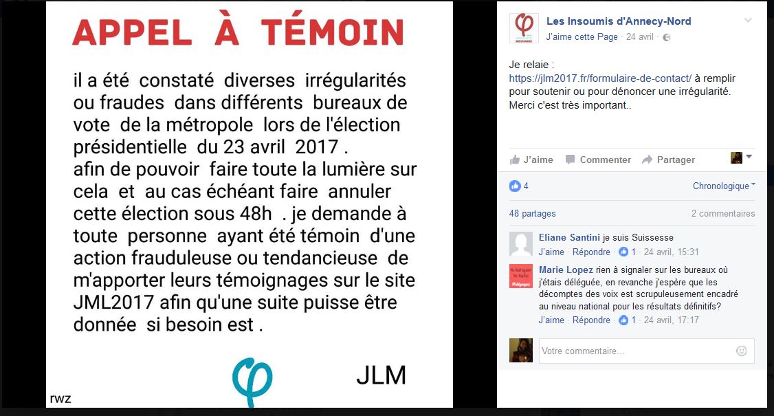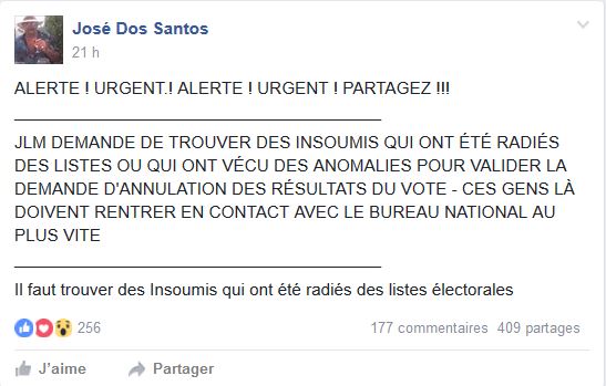 Le post a été épinglé sur la page « Je vote Mélenchon au 1er ET au 2e tour », suivie par plus de 65.000 personnes. Joint par Streetpress, Raquel Garrido, porte-parole du mouvement, explique que la France insoumise n’est pas à l’origine de cet appel. Ce qui n’empêche pas le hoax de tourner en boucle, commenté et liké par des dizaines d’internautes. Les couacs de cette élection sont brandies comme des preuves accablantes que cette élection est non seulement décevante mais surtout illégale.