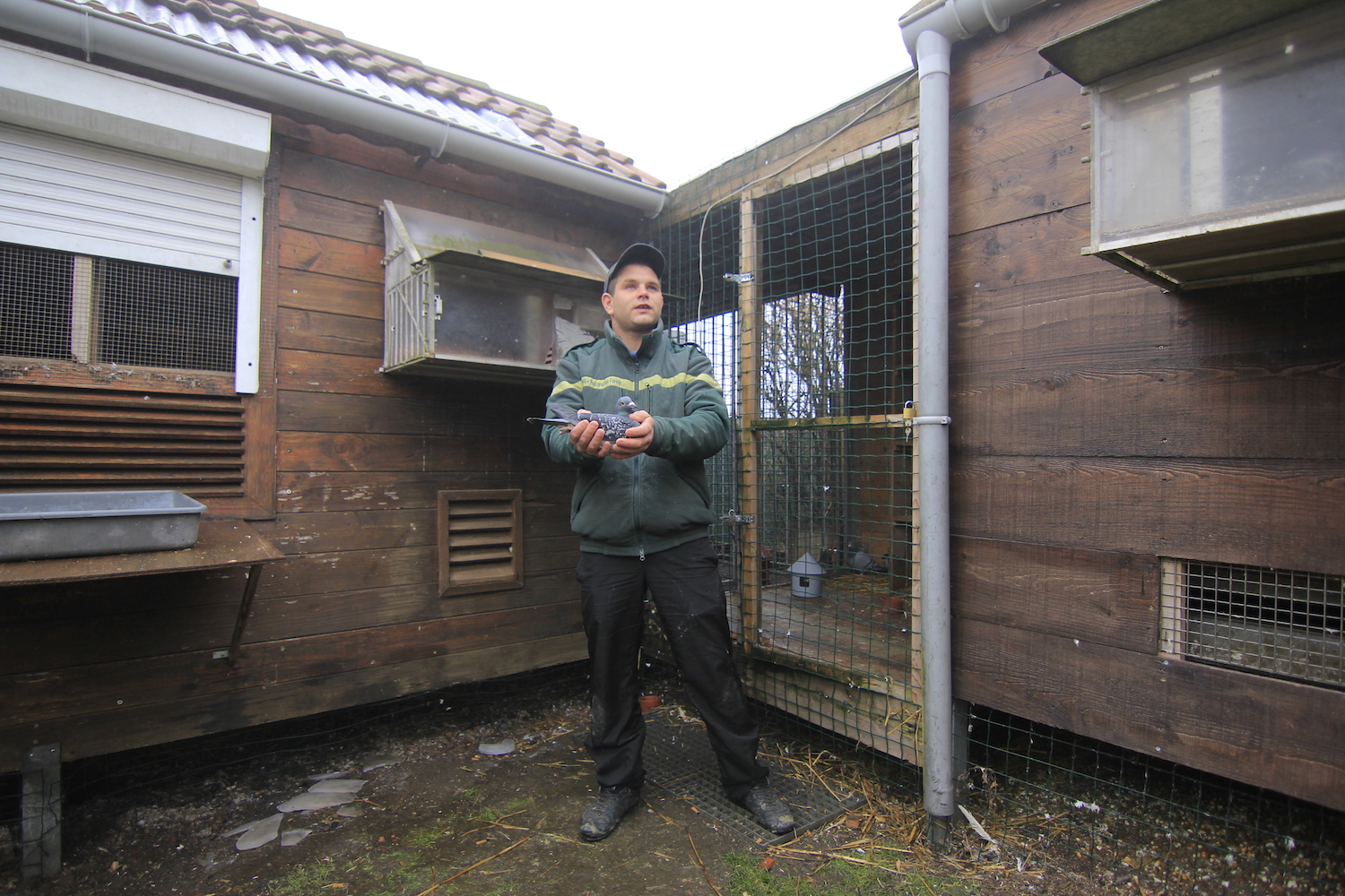 Devant son pigeonnier, Kevin, cigarette au bec et pigeon à la main, évoque la jalousie qui gangrène le milieu des colombophiles :