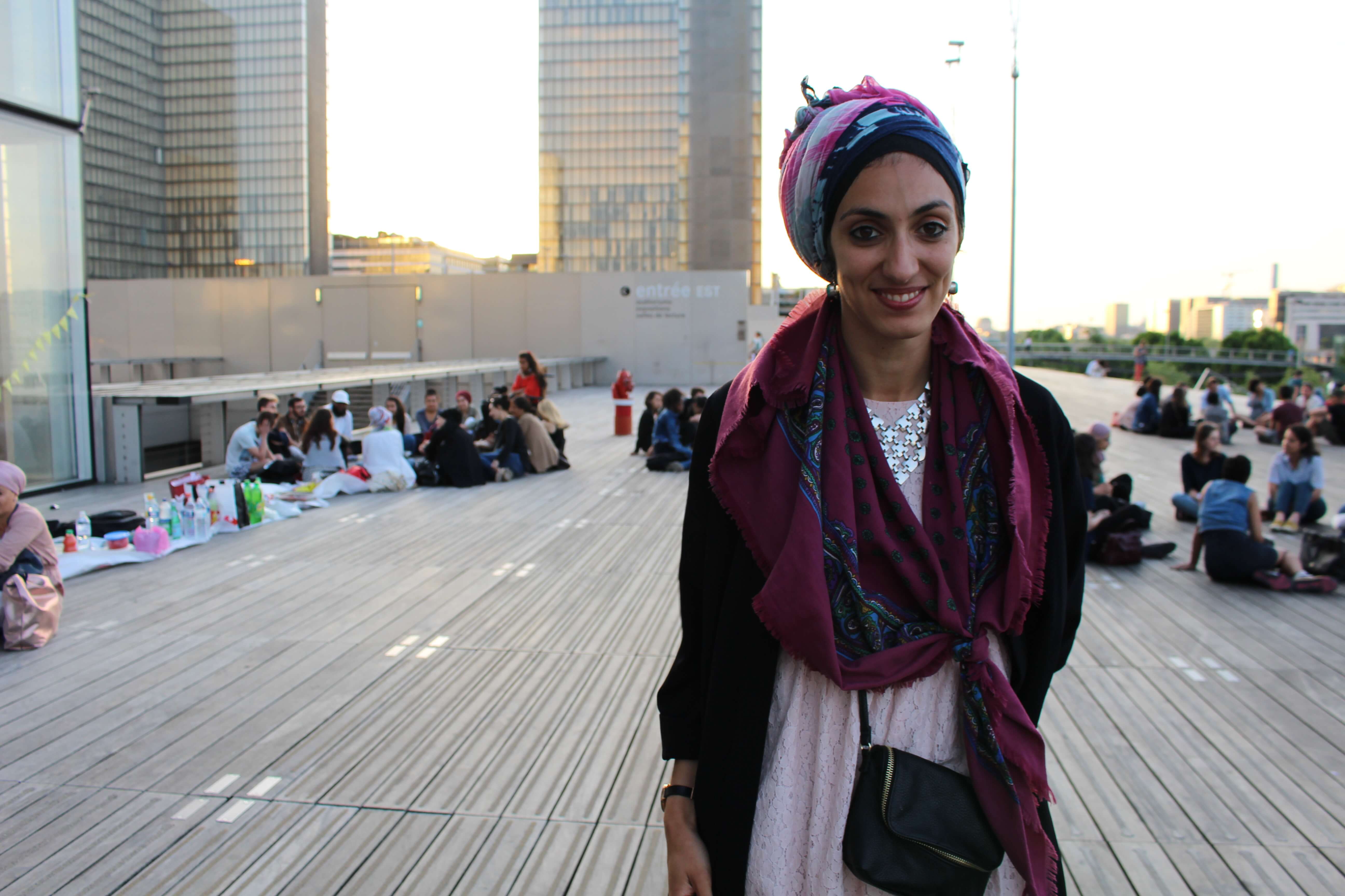 Bibliothèque François Mitterrand, Paris 13e – « On n’avait pas tout compris, on l’a joué un peu solo », rigole gênée Meryem, 24 ans. La jeune femme au long cheveux noirs montre piteusement ses deux petits wraps de supermarché et ses deux canettes de soda. « Avec ma copine, on avait compris que c’était en mode pique-nique. On aurait aussi cuisiner un petit truc sinon… » Devant elle, c’est une montagne de plats familiaux et d’énormes assiettes de pâtisseries qui s’entassent par terre, sur une nappe en papier blanc. Ce soir, posée sur l’esplanade de la bibliothèque nationale, l’étudiante en master 1 d’ingénierie est venue partager un ftour avec près de 200 personnes. Une initiative de l’asso Lallab – dont le but est de faire entendre les voix des femmes musulmanes – co-fondée par Sarah Zoak, qui porte un énorme sourire aux lèvres :
