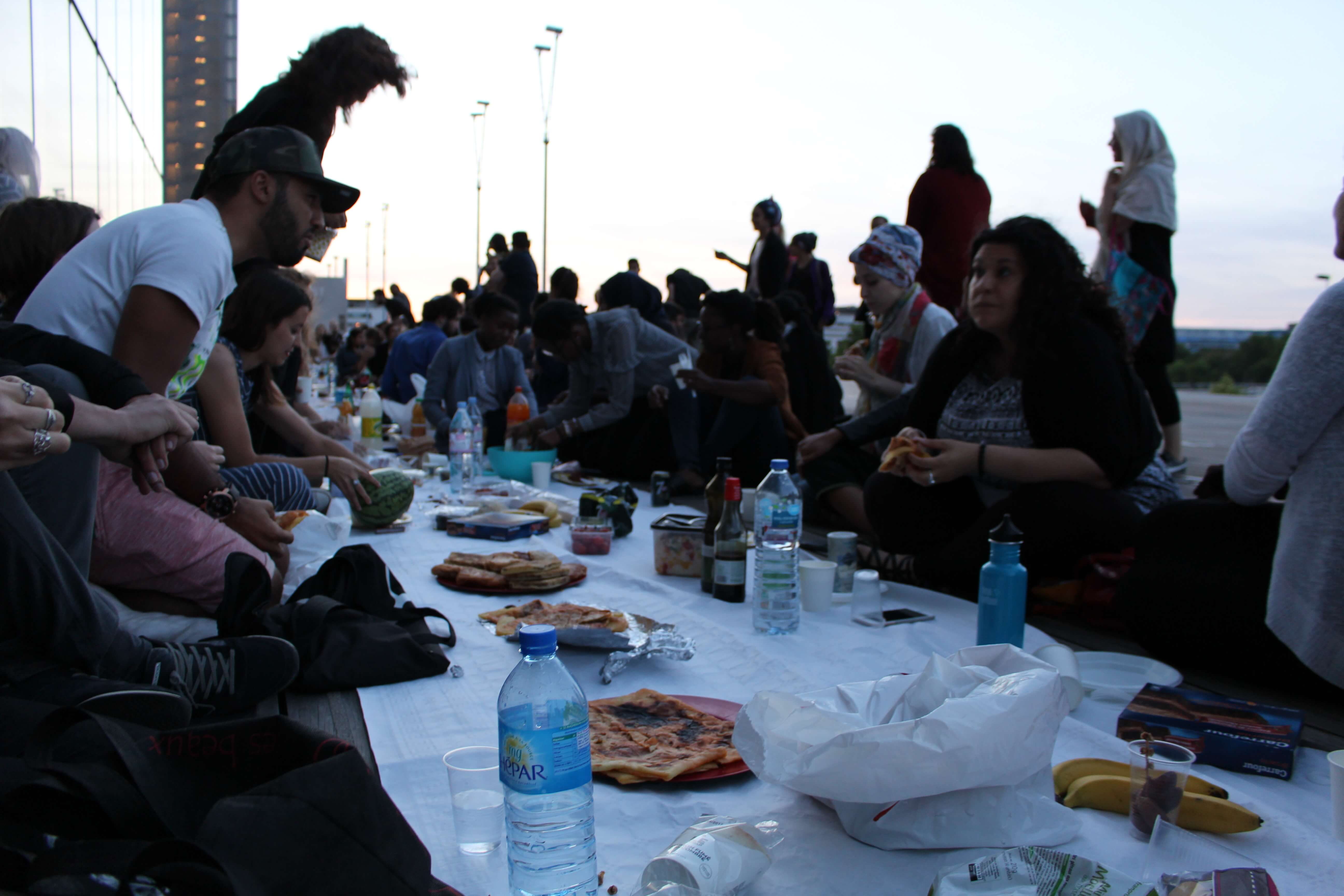22h. Une participante hurle « c’est bon, on peut manger ! ». Les hostilités sont lancées ! Au loin, un nouveau groupe arrive. Une partie de l’asso Coexister – qui milite pour le vivre ensemble et pour des causes anti-racistes – débarque au ftour. « On organisait un truc juste à côté, sur les quais. Ç’aurait été idiot de ne pas se rassembler », explique Amine, 27 ans, et responsable de l’association dans le sud de Paris. « Convergence des luttes », rigole Attika en levant le poing, avant de reprendre plus sérieusement : « On se veut hyper inclusives. Notre porte est ouverte à tous. »