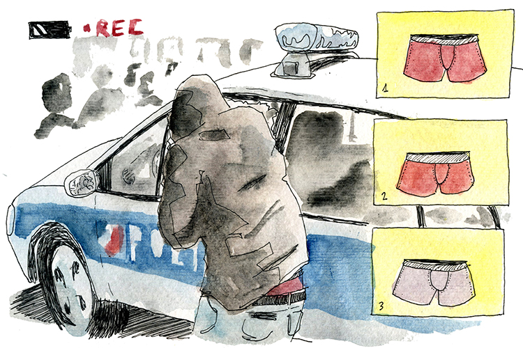 « Les policiers se sont basés sur la couleur du caleçon, mais aussi sur la les boursouflures du pantalon », explique le président du tribunal, pour confirmer la version du policier-témoin-anonyme. « Oui, j’ai l’habitude de mettre mon téléphone, mon portefeuille et d’autres affaires dans mes poches », répond Antonin Bernanos.