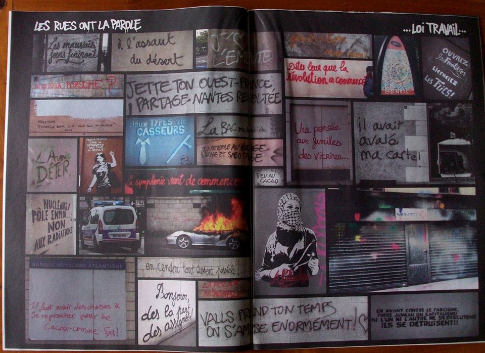 La couv’ du numéro zéro du magazine « Nantes révoltée » annonce la couleur : ton cash et ligne éditoriale radicale. En guise de sous-titre, « Du zbeul dans la métropole ». Leur objectif assumé, « faire bouger les lignes » et « contribuer à l’installation d’un climat de défiance à l’égard du pouvoir ». Au fil des pages, on découvre un tuto pour transformer un extincteur en bombe de peinture (sans doute pour repeindre les bleus en rouge), des récits de manif au cœur du cortège de tête, une mosaïque de graffs politiques…