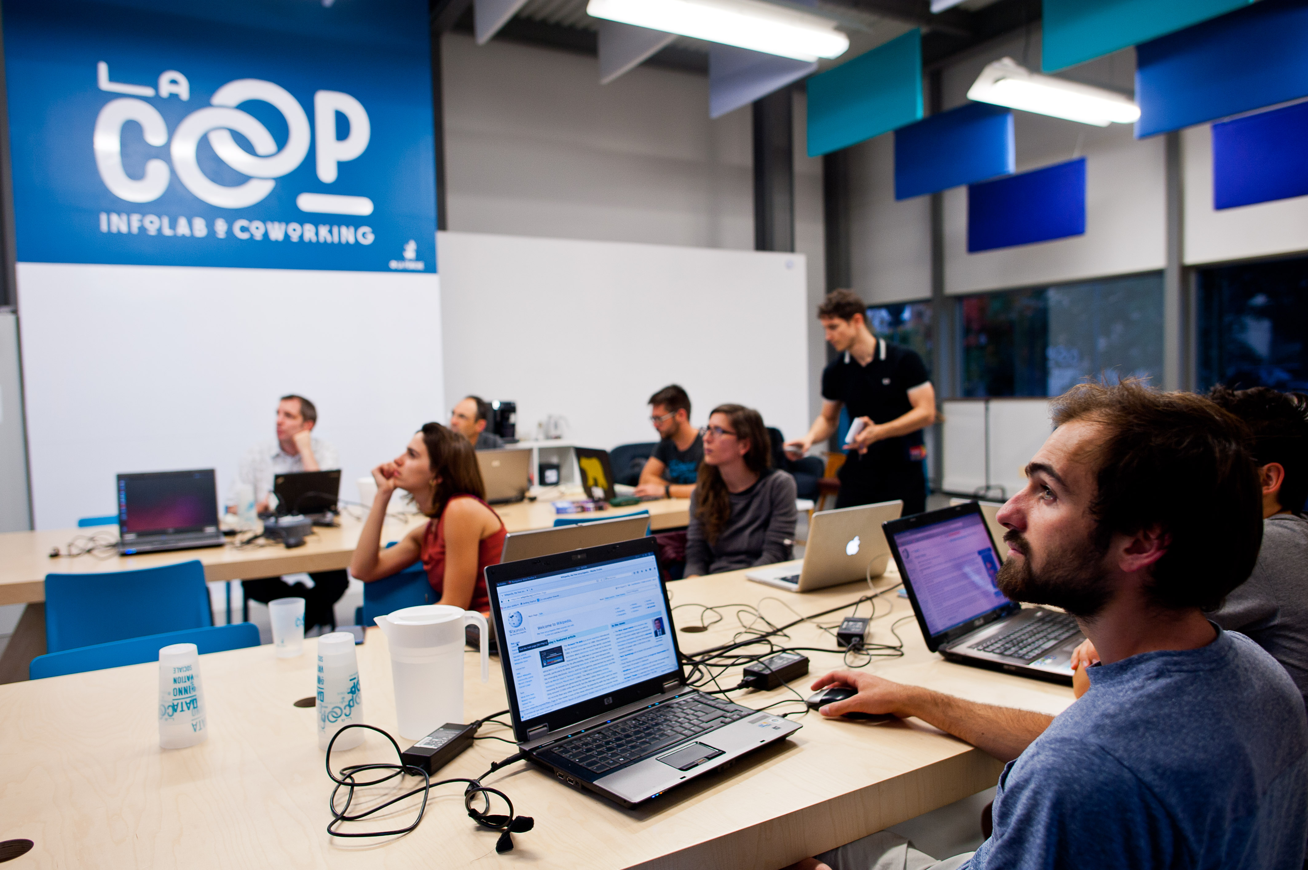 Son voisin de table, lui, vient de terminer ses études d’ingénieur informatique et cherche un travail. Beaucoup ont déjà un pied dans le numérique. Tout ce petit monde a posé ses ordis sur les tables de la Coop Infolab, une coopérative de geeks qui s’est mise en tête d’initier les néophytes au maniement des données. Le local est calé au rez-de-chaussée d’un immeuble de bureaux, dans une ancienne zone industrielle en reconversion. A part la voix de l’animatrice de l’atelier, on entend que le bourdonnement du rétroprojecteur, pendu au plafond haut de cette salle au décor minimaliste.
