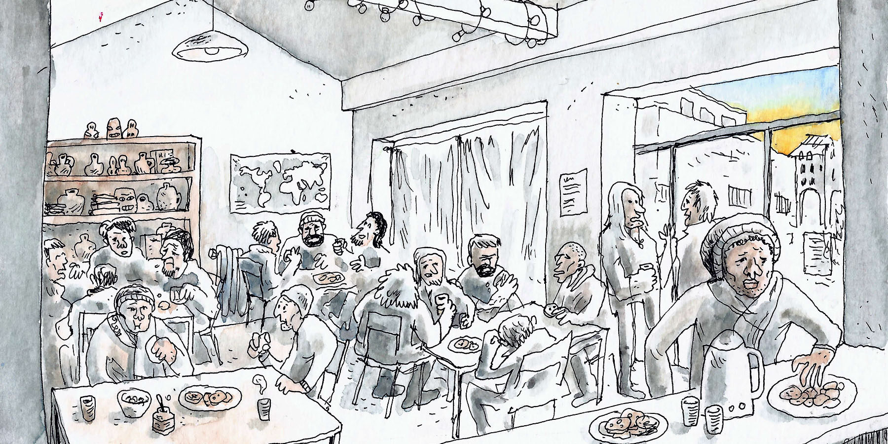Devant la porte d’entrée du Camres, Gilles sert du café à ceux qui préfèrent la fraîcheur matinale à l’agitation de la salle. « Combien de sucres pour toi ? », demande-t-il à Philippe. Cet habitué, à la rue depuis une paire d’années, se promène toujours avec deux énormes baluchons, porte un épais manteau en cuir retourné. Il se fait appeler l’empereur.