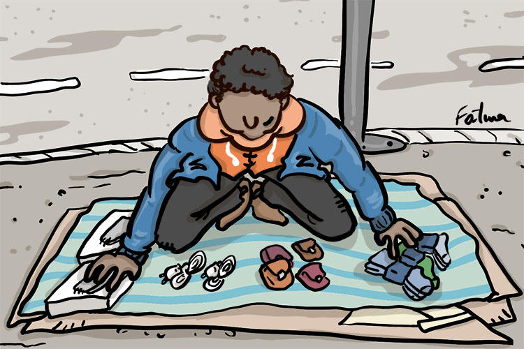 La police nationale ne saisit pas l’argent de la vente, uniquement les cigarettes. Seuls les douanes s’attaquent au cash. Également en civil, ils viennent faire un tour dans le coin une ou deux fois par semaine. Un jour, je me suis fait prendre la main dans le sac. Ils m’ont donné un papier sur lequel était inscrit le montant confisqué « 50 euros », ainsi que mon faux nom et la date. À la différence des autres, ils parlaient plutôt bien anglais, et m’ont expliqué pour qui ils bossaient quand je me suis étonné qu’ils puissent me prendre de l’argent.