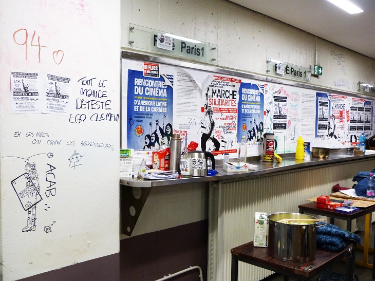 Fac de Tolbiac, Paris 13e – Dans un couloir reconverti en coin cuisine, où une tambouille courgettes-oignons mijote, les étudiants de la commission médias s’agitent. « Écris pas ça, ce n’est pas français. » Ce mercredi 11 avril au matin, une annonce du président de l’Université Paris 1 laissait penser à une évacuation imminente des bloqueurs de la fac. À 12h45 précises, ils sont quatre regroupés autour d’un petit ordinateur pour rédiger un communiqué de presse. « Ils ne nous vireront pas, la préfecture vient de démentir. Et il y a trop de journalistes devant les grilles ! », croit savoir Tomek, 19 ans, lunettes rondes sur le nez.
