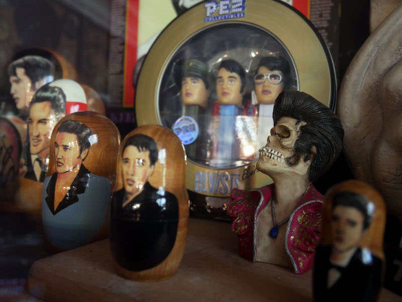 Serge aime se définir comme « un collectionneur de collections ». Tout ce joyeux « bordel », ce sont des trésors personnels, des cadeaux de clients ou encore des trouvailles aux puces. Le moindre petit centimètre carré est exploité. Au plafond, écharpes de foot et fanions colorés se mélangent aux maillots menthe à l’eau. Des picture-discs, des 45 tours et des 78 tours en tout genre tapissent les murs. Ancien choriste, Serge prête attention à la voix des artistes. Entre deux clients, il confie être tombé sous le charme de celle d’Elvis. Une vitrine entière lui est consacrée. Buste imposant du King, poupées russes et figurines PEZ à son effigie font partie des meubles.