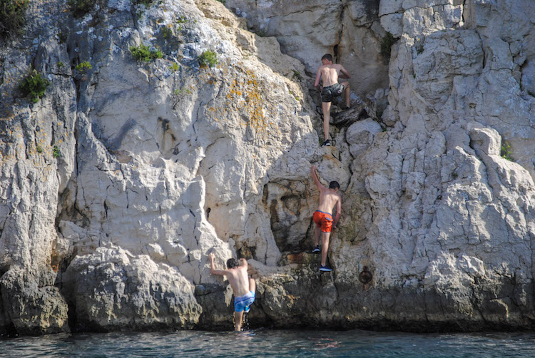 « Si tu grimpes en haut des rochers, il n’y a qu’une seule façon de redescendre », lâche Chloé. En haut de la Calanque d’En Vaux, l’une des plus belles à l’Est de Marseille, la petite blonde a prouvé à toute une assistance massée en contrebas que niveau plongeon, les filles ne comptent pas pour du beurre. Une fois au bord du précipice, la jeune femme passe devant son grand frère, un brun d’une tête de plus, qui hésite à plonger parce que, finalement, « c’est haut quand même ». Elle s’élance avant de disparaître dans l’eau puis de remonter à la surface. Un brouhaha moqueur emplit la baie. Il est destiné à son frère. L’un des badauds n’hésite pas à lâcher un sonore « mais saute va, tié pas un homme », à son encontre. La jeune femme, elle, semble avoir passé le test.