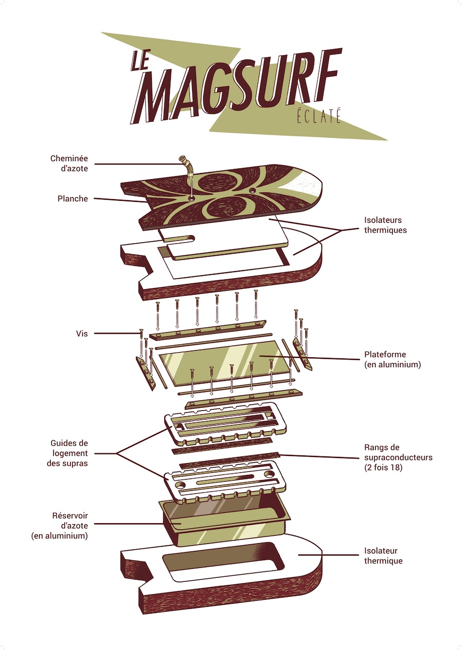 En 2011, les chercheurs font la première démo de leur nouveau-né, le MagSurf. Posée sur des rails de cinq mètres de long, la planche reste suspendue à quelques centimètres du sol. Comment ? Grâce à la lévitation supraconductrice, spécialité de l’équipe Squap. À très basse température, les matériaux dits supraconducteurs changent de propriétés. « Ils présentent alors une résistivité nulle et les électrons peuvent y circuler sans friction. Ils expulsent ainsi le champ magnétique, ce qui fait léviter l’objet », continue le chercheur. À l’intérieur du MagSurf, on trouve deux barres supraconductrices qui sont refroidies avec de l’azote liquide. Il suffit alors de poser le MagSurf sur des rails aimantés et un effet de répulsion engendré par l’azote va créer la lévitation durant quelques minutes, avant de nécessiter un rechargement. Alain Sacuto commente :