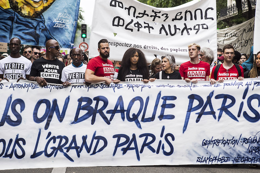 Même s’il n’intègre pas officiellement le comité Adama, le philosophe joint le geste à la parole. Samedi 27 mai 2018. Paris. Geoffroy de Lagasnerie est à la gauche d’Assa, planté derrière une énorme banderole « C’est nous on braque Paris, c’est nous l’grand Paris » – en référence au morceau Grand Paris de Médine. Son ami écrivain Edouard Louis, également proche du mouvement, est là, accaparé par des journalistes. Quelques heures plus tôt, les deux intellectuels publiaient une tribune dans le Monde titrée, « Le 26 mai, nous serons dans le cortège de tête avec le comité Vérité et justice pour Adama » :