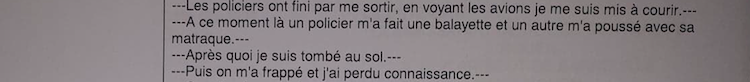 « Un policier m’a fait une balayette et un autre m’a poussé avec sa matraque après je suis tombé au sol. Puis on m’a frappé et j’ai perdu connaissance. »