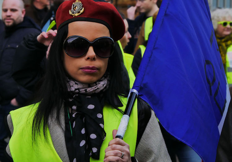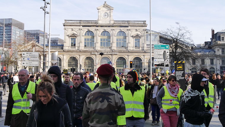 Samedi 16 février, place du Général-de-Gaulle à Lille – Laurent mène le cortège, vêtu de son vieil uniforme de la marine. De nombreux manifestants en gilet jaune viennent le saluer. Certains demandent à l’ancien militaire de calmer un homme nerveux, tout de noir vêtu. Il s’empresse de le rejoindre et n’hésite pas à crier :